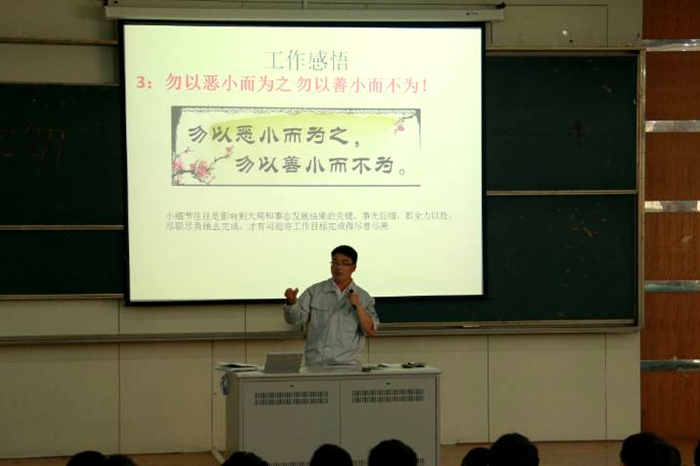马艳东同学2011年底进入“江苏恒立”工作,短短两年半时间,凭借其扎实的专业基础,踏实肯干的工作态度,认真刻苦的学习态度,一步一个脚印的从一名设备管理员成长为公司物流采购部主管,得到了公司领导的一致认可。马艳东主要和大家交流了一些他的就业和工作感悟,他告诉同学,对于即将面临就业竞争的老员工来说,是时候放低姿态,勇敢地面对现实了;在工作过程中,做事重要,做人也重要,这才是成功之处;勿以恶小而为之勿以善小而不为,事无巨细,都要全力以赴;职场新人,苦、也要吃得,屈、也要受得;要学会珍惜自己的工作。