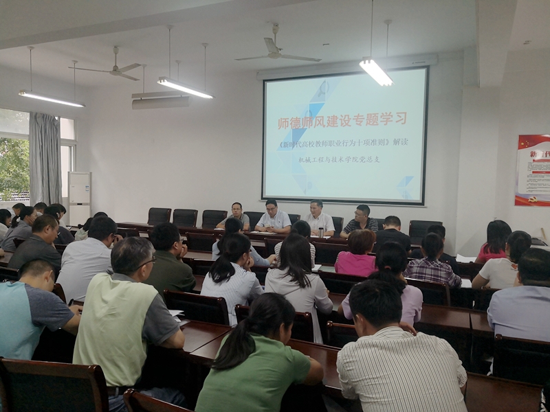 王荣兴带领全体教职员工学习了《新时代高校教师职业行为十项准则》和《专家解读新时代教师职业行为十项准则》,他给机械公司全体教师提出四点要求:机械公司教师要坚持正确的政治方向;教师应该充分认识教师职业的神圣使命;教师要具有高尚的道德情操,树立良好的师德师风;教师要不断学习,提高自己的人文素养和专业水平。