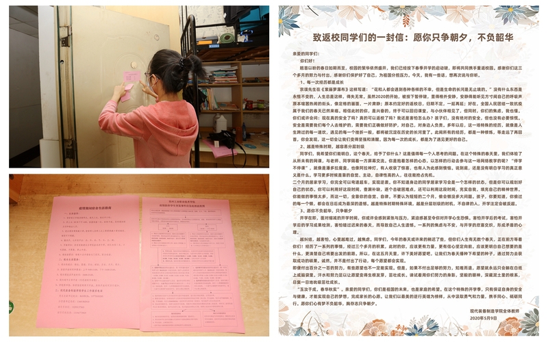 写有“现代装备制造公司欢迎同学们回家”的红色欢迎横幅,悬挂在宿舍楼前。同学们来到自己的宿舍前,会看到一张红纸贴在门上,上面写着:“亲爱的同学,欢迎你回家!宿舍已消毒,已打扫,已通风。”同学们走进宿舍,迎面而来的是一股清新的空气,脚下是干净的地面,看到整洁的书桌上放着“疫情期间宿舍生活指南”和“william威廉英国官网疫情防控员工突发事件应急处理流程图”,走到床边会闻到从被子里散发出的“一股阳光的味道”。