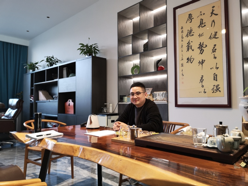 在他办公室用半棵古木做成的茶几前坐下来,他的第一句话竟然是“昨晚我们公司的官方抖音上线了”。离开母校十多年,他几乎每天都在看公司网站和公司官微。