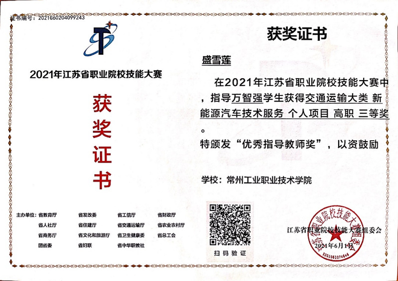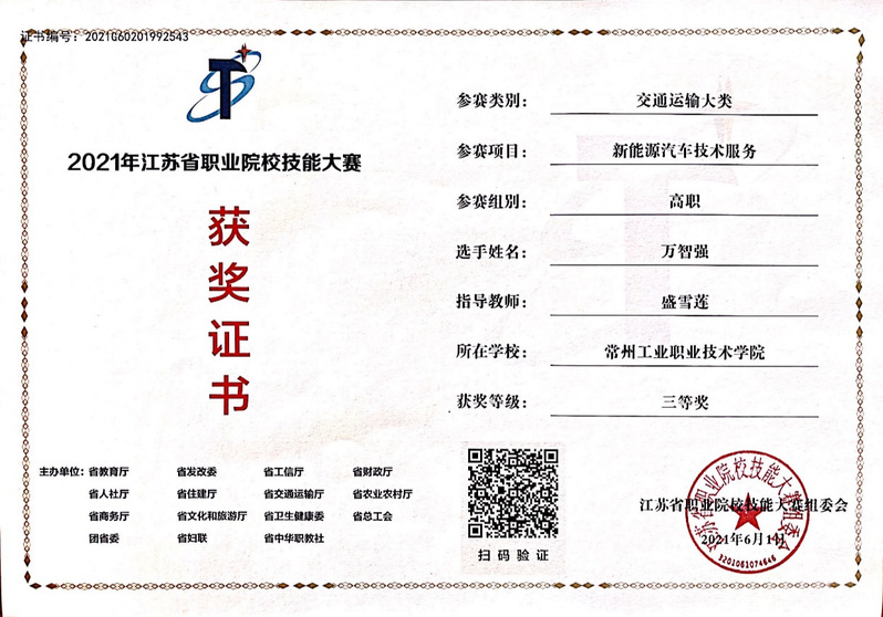 员工积极参加各类技能技术比赛,获得江苏省职业院校技能大赛“新能源汽车技术”三等奖。