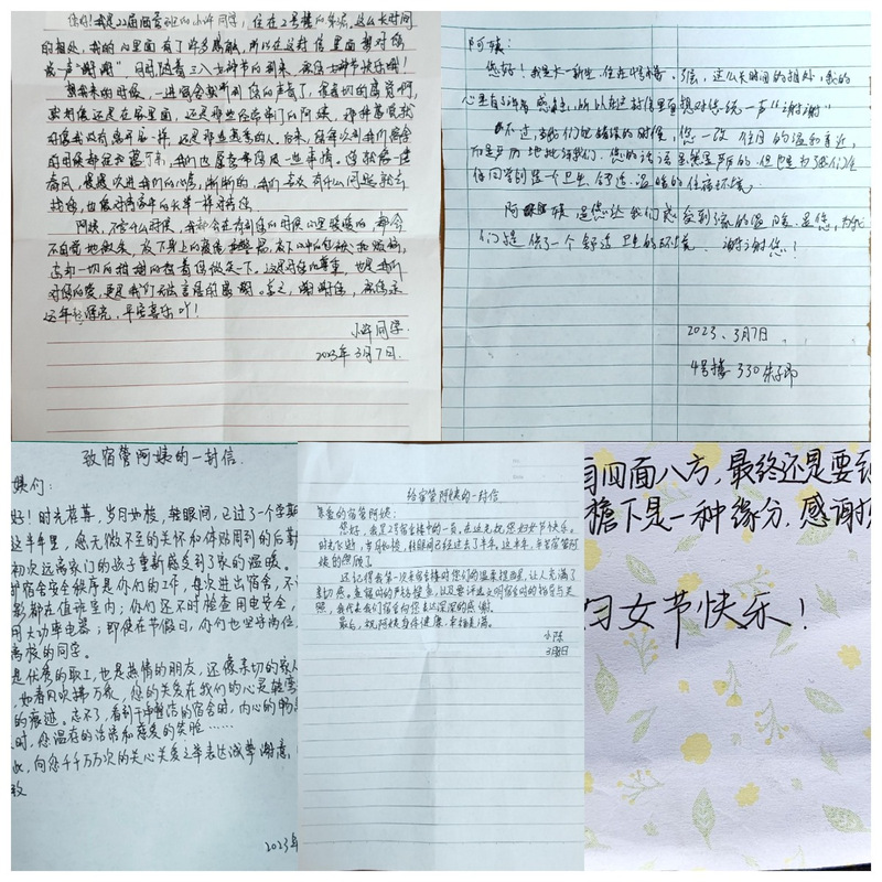 3月8日下午,馨缘种子社的志愿者们带着几十封“情书”、几份手工分别来到公司10栋员工公寓楼,这些礼物均是公司馨缘种子社的老员工志愿者们亲手创作。志愿者们将这些特殊的礼物送给了校园里的妈妈——宿管阿姨们,并向她们致以节日的问候和美好的祝愿。一句句祝福的话语,一个个暖心的举动,一件件精致的手工,同学们用自己的方式诉说着对“妈妈们”的感激之情。