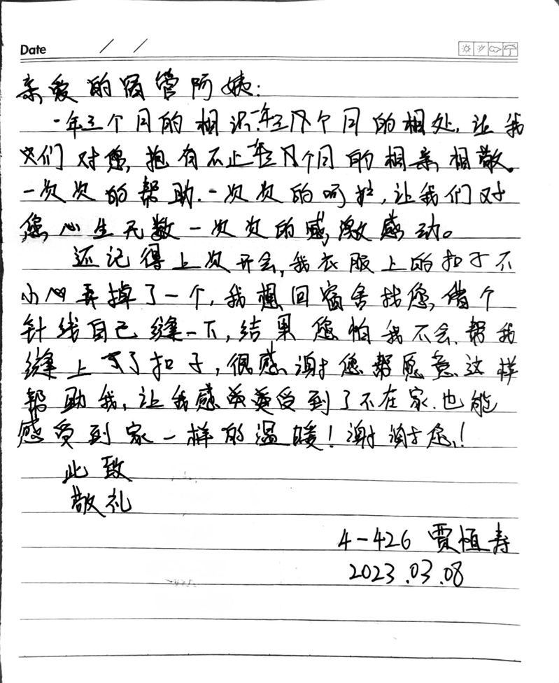 “有一次,我急着去开会但衣服上的纽扣掉了,原本想向阿姨借一下针线,没想到阿姨直接帮我缝好了。在阿姨身上,让我感受到了妈妈的温暖。”四号楼的贾恒寿这样写道。
