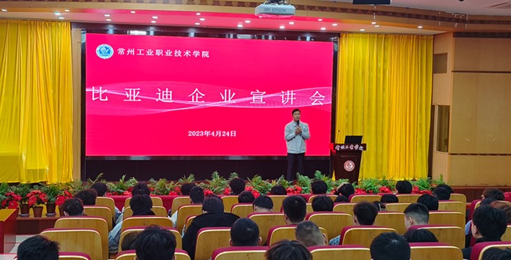 比亚迪公司咸赛杰经理从公司发展历史、企业文化、工作环境、员工待遇、晋升空间、岗位需求等各方面作了详细介绍。比亚迪是一家致力于“用技术创新,满足人们对美好生活的向往”的高新技术企业。经过20多年的高速发展,已在全球设立30多个工业园,实现全球六大洲的战略布局。业务布局涵盖电子、汽车、新能源和轨道交通等领域,并在这些领域发挥着举足轻重的作用,全方位构建零排放的新能源整体解决方案,营业额和总市值均超过千亿元。2019年4月,总投资100亿元的比亚迪华东(常州)产业基地落户常州,2022年产值达280亿元。2023年初,总投100亿元的比亚迪新能源汽车核心零部件产业园项目再次落户常州,项目建成后将年产30万套智慧动力总成、传动系统等核心零部件。与会同学们认真听讲,现场反应热烈,会后,同学们还与企业代表进行了进一步的沟通和交流。