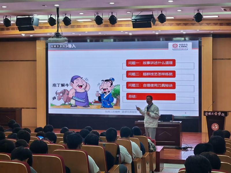 讲座中,杨余明以大型养路机械——捣固车的加工与优化的各个环节为线,分享了他从普通职工成长为中央企业技术能手,全国技术能手,享受国务院特殊津贴的逐梦历程。他凭借灵巧的双手和坚韧的意志攻克了一道又一道难题,为企业培养了一批又一批创新型、技能型人才,被大家尊称为“数控教头”。在他的眼里没有“差不多”,永远是精益求精。他殷切寄语同学们:要弘扬工匠精神,追求完美极致,同时也要不忘初心,方得始终。