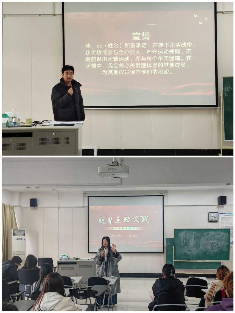 为充分实现团辅活动的功能,使“团体动力”得到最大程度的发挥,活动采取了老师引导,同学参与的模式。朱丹老师在活动一开始,带领同学们进行宣誓,共同达成了团体约定,并讲解活动过程中的注意事项。接着陈雪老师带领同学们移步至操场开展团体辅导活动。