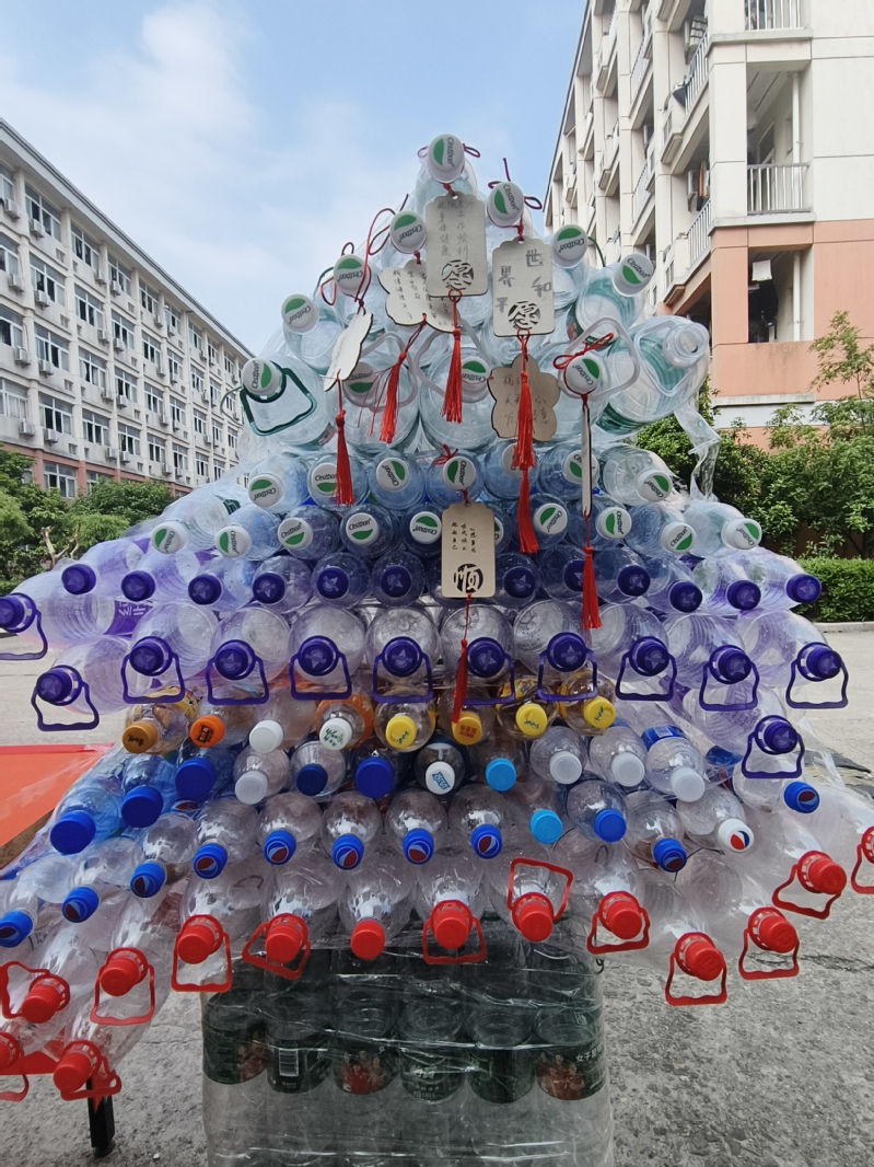活动现场,绿之源保护协会的志愿者们布置场地,准备丰富多样的环保小游戏。参与活动的同学们热情高涨,纷纷投入到游戏中去。套圈游戏、扔沙包游戏和摸石头过河游戏环节不仅锻炼了同学们的身体,更让他们在轻松愉快的氛围中感受到了保护环境的乐趣。完成游戏后,同学们还能获得相应的印章,集齐三个印章即可兑换精美的环保小奖品。游戏结束后,同学们积极参与“废物再制作”活动,将塑料瓶搭建许愿树,在实践过程中培养员工动手能力,提高废物利用、爱护环境的意识。