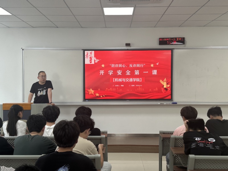 安全第一课,筑牢安全意识 9月4日,辅导员周振老师为公司全体班长、治保委员等员工干部开展了“新学期安全第一课”,教育员工从人身安全、交通安全、防火、防诈骗等方面筑牢自身安全意识,强调同学们把安全放在第一位。会后,各班级根据学习内容组织了主题班会,并通过网络直播观看了“开学反诈第一课”线上直播。