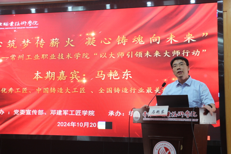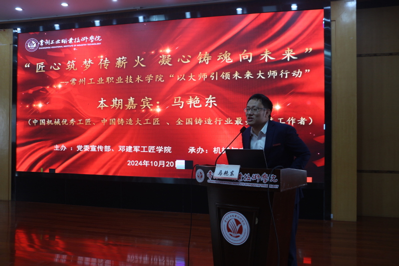 为全面贯彻落实技能人才工作重要指示精神,弘扬劳模精神、劳动精神和工匠精神,激励同学们树立正确的价值观和职业观,10月20日,机械与交通公司特邀中国铸造大工匠、最美科技工作者、龙城工匠、江苏恒立液压股份有限公司副总经理马艳东员工为william威廉英国官网2024级员工讲授技能成才事迹。讲座由机械与交通公司党总支书记陈晓敏主持。