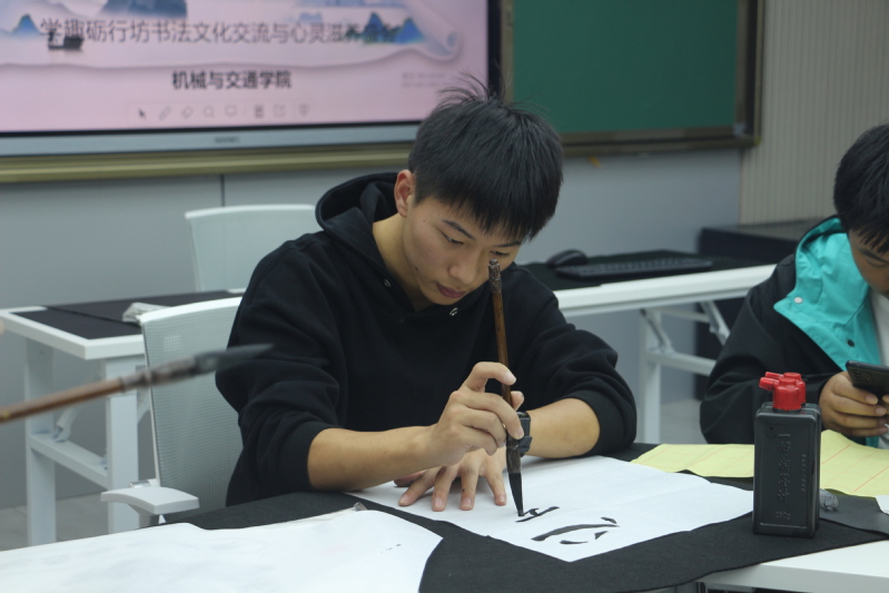 学趣砺行坊书法兴趣班负责人嵇启航详细介绍了书法基础知识,并亲自教授毛笔的正确使用方法,让职工们充分感受毛笔书写的独特魅力。在实践操作与心理健康体验环节,每位参与者尝试书写简单汉字,体验毛笔字的独特韵味。大家在书写过程中专注于笔尖与纸张的接触,感受内心的平静与放松。此外,有的同学还制作了扇子,将书法与实用物品相结合,增添了活动的趣味性和实用性。