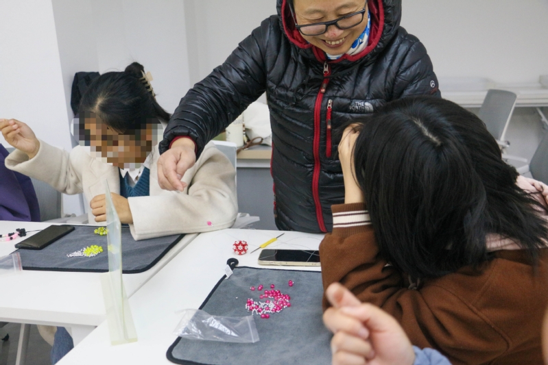 活动伊始,大师化身耐心导师,一对一悉心指导员工。起初,员工们面对零散珠子与鱼线有些不知所措,双手微微颤抖,穿针引线时屡次失败,但青涩与笨拙并未磨灭他们的热情。在大师轻声鼓励、分步讲解下,员工们渐入佳境,一颗颗珠子被稳稳串起,专注神情替代了最初的紧张。随着活动深入,员工间互助氛围愈发浓厚。高年级同学主动帮扶学弟学妹,交流心得、分享技巧;原本内向羞涩的员工也打开心扉,融入集体。这里不仅是技艺学习场所,更成了温暖交流港湾。