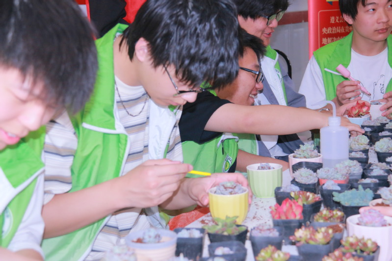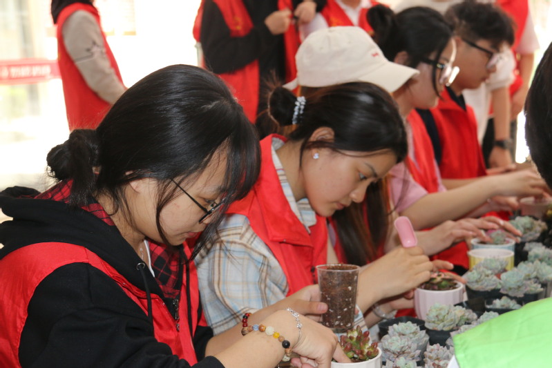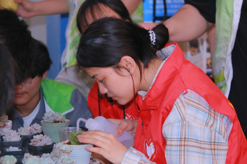 绿之源社团成员在活动现场布置了多肉植物种植体验区。参与者领取花盆、营养土及多肉幼苗后,在志愿者指导下学习配土、移栽、装饰等技巧。“叶片排列要疏松透气,浇水要遵循‘宁干勿涝’原则……”社团负责人姚锡祥边示范边科普多肉养护知识。