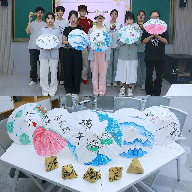 活动以端午文化讲解开篇,追溯屈原精神与民俗内涵,随后开启画纸伞、制作宣纸粽等实践环节。参与者以油纸伞为画布,挥毫题写“端午安康”等吉祥词句,或以墨色勾勒龙舟竞渡;宣纸则被折叠塑形为立体“粽子”,嵌入书法诗词与金粉纹饰,传统手作与艺术创作交织。最终,作品展览展现创意与文化的碰撞,同学们纷纷表示,在指尖传承中深化了对端午人文的理解。